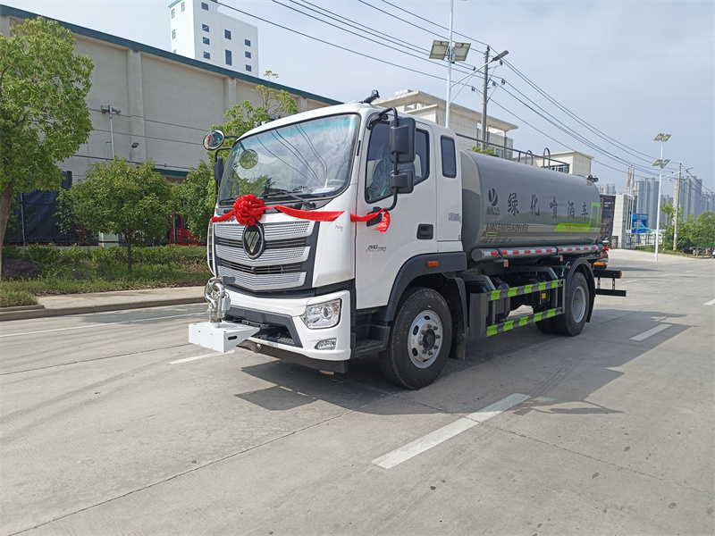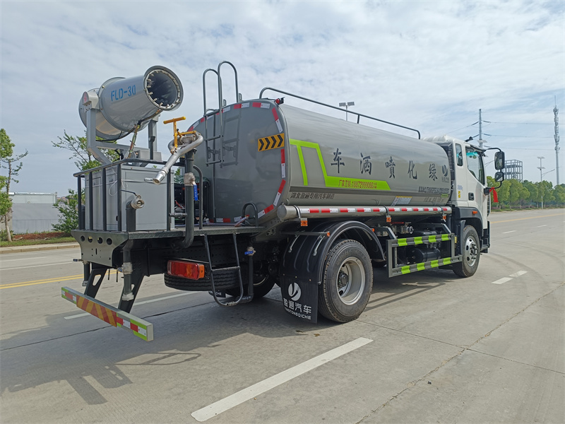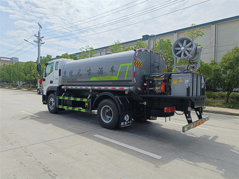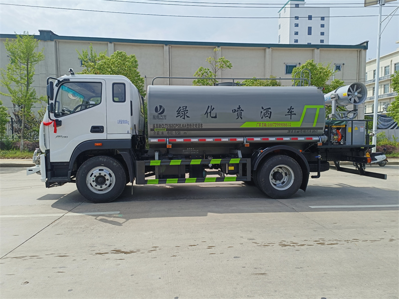 产品简述:纵昂牌 CLT5188GPSEQ6A 型绿化喷洒车标配前喷(鸭嘴)、后对冲、 后洒、侧喷、后置式工作平台,平台上配置绿化水炮(可 360°旋转,既可以调 成柱状,也可以调成雾状),配备优质大功率专用洒水泵(可自吸自排,可从河 里或池塘抽水到罐体),取力器,杂物过滤网,消防接口,自流球阀系统、取力 器、球阀、滤网均为国家标准产品,主管道加粗,法兰垫、法兰盘加厚,大通径 球阀。整体具备性能优良安全可靠、效率高、流量大、维修方便等特点