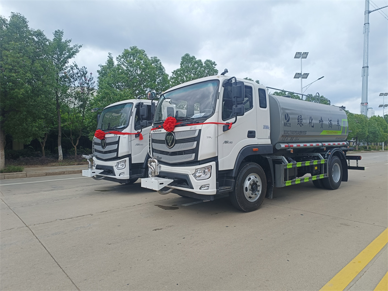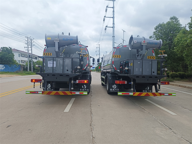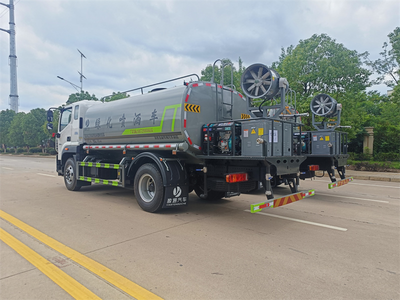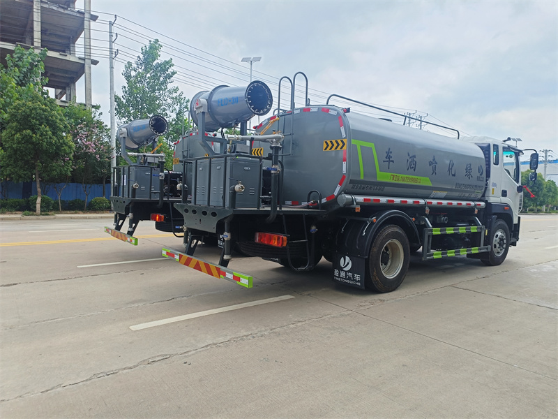 罐体约为 15 方、边灯带电,罐体尾部上方标配 2 个红色示宽灯 、前喷为鸭嘴直冲,标配后对冲,用户可根据自己的需求,来调整对冲位置 、冲孔平台(承载能力加强),炮筒后盖为定制型螺栓卡扣 、前喷、后对冲、后洒球阀均采用 50 大通径不锈钢球阀 、新式轴承式水炮,更加耐用。配 60-90 型水泵 、侧喷和高炮管道加粗并配 65 大通径不锈钢球阀,压力更大 、防腐法兰垫片 、铝制后洒,不易炸开 、罐体自动焊(美国林肯焊机及电源),拼板自动焊接封头环缝焊接,无气 孔焊缝美观 、爬梯、侧护网、后保险杠均为螺栓连接方便拆卸维修 、塑料挡泥板替代铁挡泥板更加轻便,用螺栓连接方便拆卸 、前部、后部主管连接处为 6 孔圆法兰连接不易冲垫