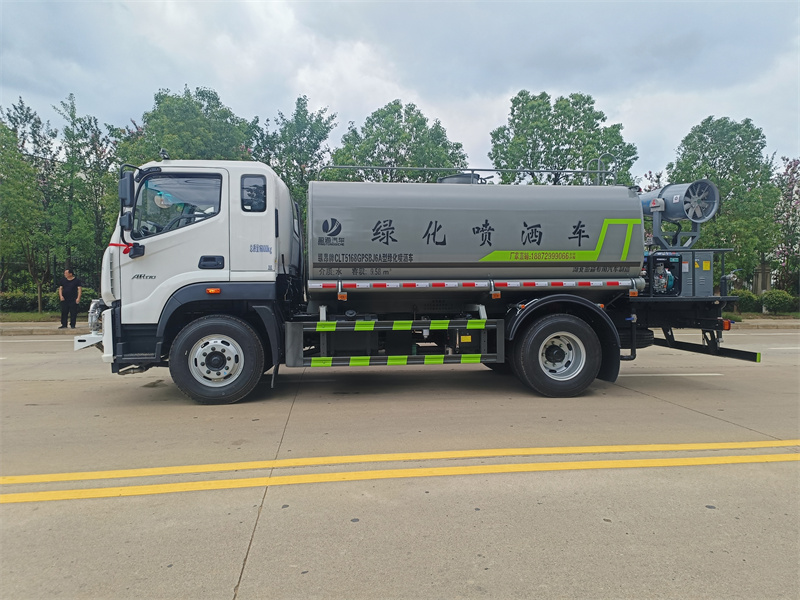 产品简述:纵昂牌 CLT5188GPSEQ6A 型绿化喷洒车标配前喷(鸭嘴)、后对冲、 后洒、侧喷、后置式工作平台,平台上配置绿化水炮(可 360°旋转,既可以调 成柱状,也可以调成雾状),配备优质大功率专用洒水泵(可自吸自排,可从河 里或池塘抽水到罐体),取力器,杂物过滤网,消防接口,自流球阀系统、取力 器、球阀、滤网均为国家标准产品,主管道加粗,法兰垫、法兰盘加厚,大通径 球阀。整体具备性能优良安全可靠、效率高、流量大、维修方便等特点