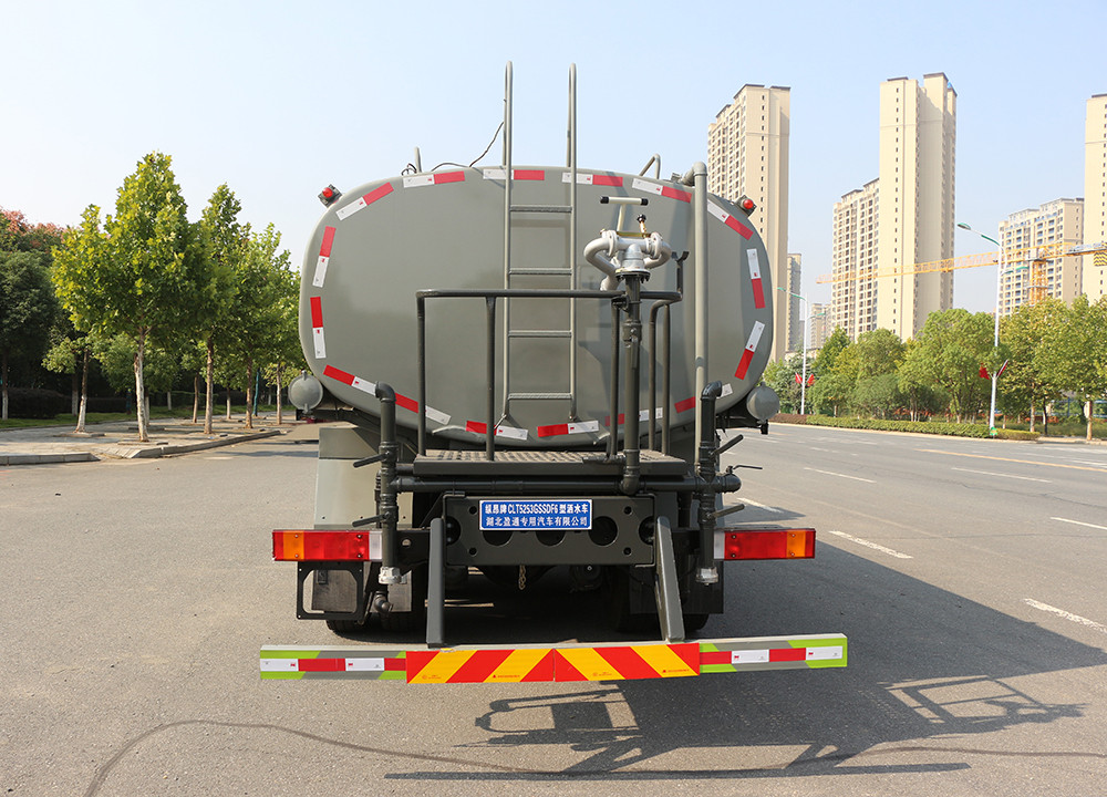 洒水系统:配备盈通汽车专用 60-90 型水泵或大功率专用洒水泵等,可自吸自排,引水时间<15min,流量较大,扬程可达 35 米左右。标配前喷(鸭嘴直冲)、后冲、后洒、侧喷,带高位花洒,带后工作平台,平台上安装专用大功率绿化洒水高炮,可 360° 旋转,能调节成直流状、大雨、中雨、毛毛雨、雾状,还可用于喷洒农药。