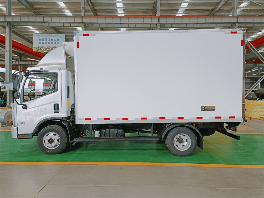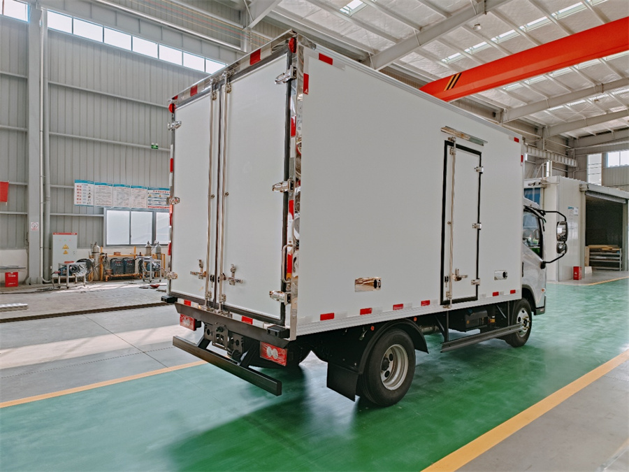 厢体底部为塑钢花纹板,厢内侧面带围裙,前部排水孔,门边条采用防雨设计和迷宫式橡胶密封条,铝合金型材包边,不锈钢包角,不锈钢门锁,加厚型不锈钢后门合页及锁件,厢体内采用LED照明灯。