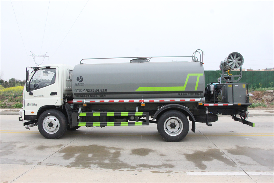 产品简述:纵昂牌 CLT5122GPSBJ6 型绿化喷洒车标配前喷(鸭嘴)、后对 冲、后洒、侧喷、后置式工作平台,平台上配置绿化水炮(可 360°旋转,既可 以调成柱状,也可以调成雾状),配备优质大功率专用洒水泵(可自吸自排, 可从河里或池塘抽水到罐体),取力器,杂物过滤网,消防接口,自流球阀系统、 取力器、球阀、滤网均为国家标准产品,主管道加粗,法兰垫、法兰盘加厚, 大通径球阀。整体具备性能优良安全可靠、效率高、流量大、维修方便等特点。